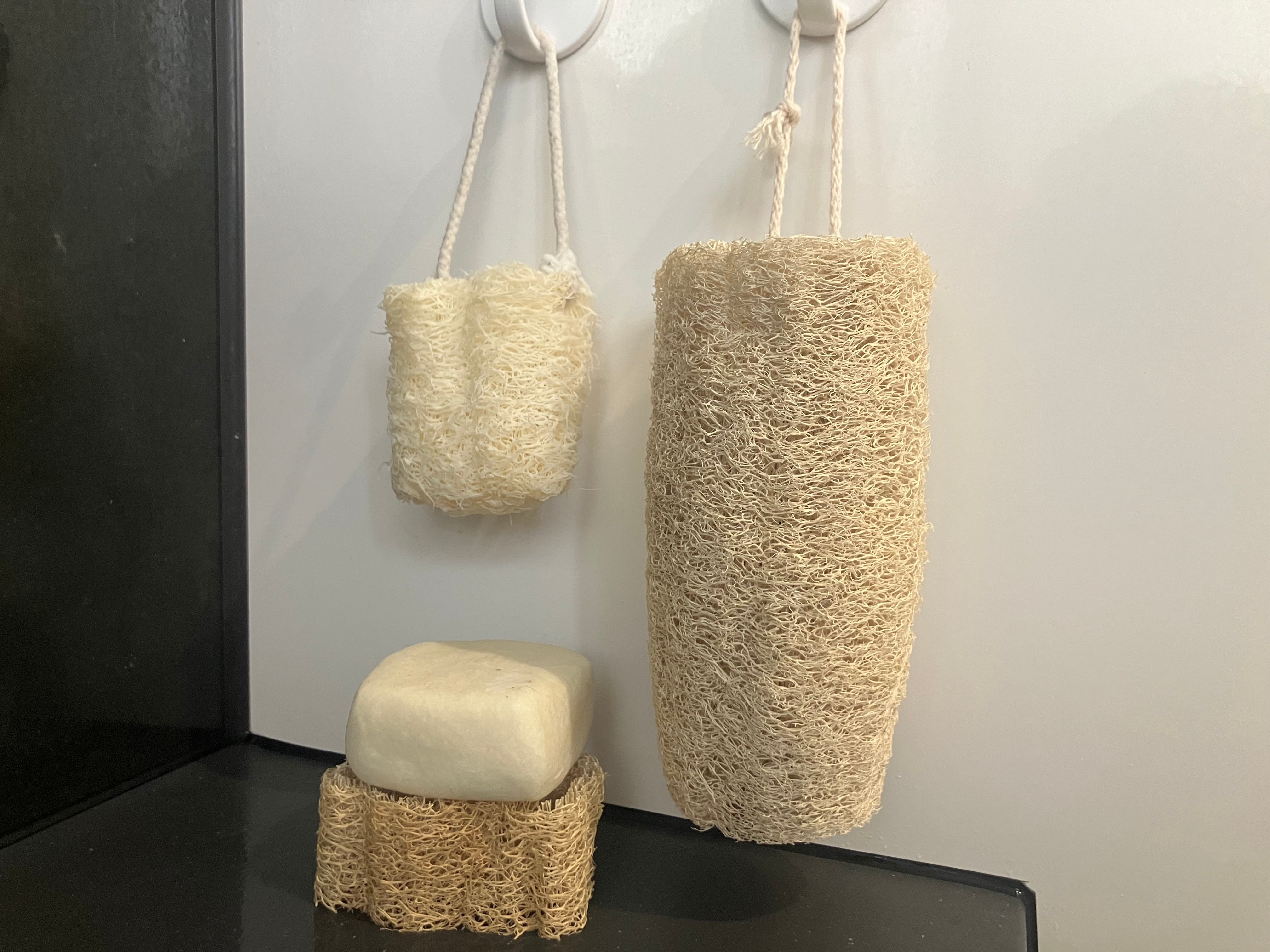 へちまの下の細い部分を活用して作った泡立てネット。プラスチックの洗顔用泡立てネットの代用ができます。ポケットになっているので小さくなった石鹸を入れる事ができます。